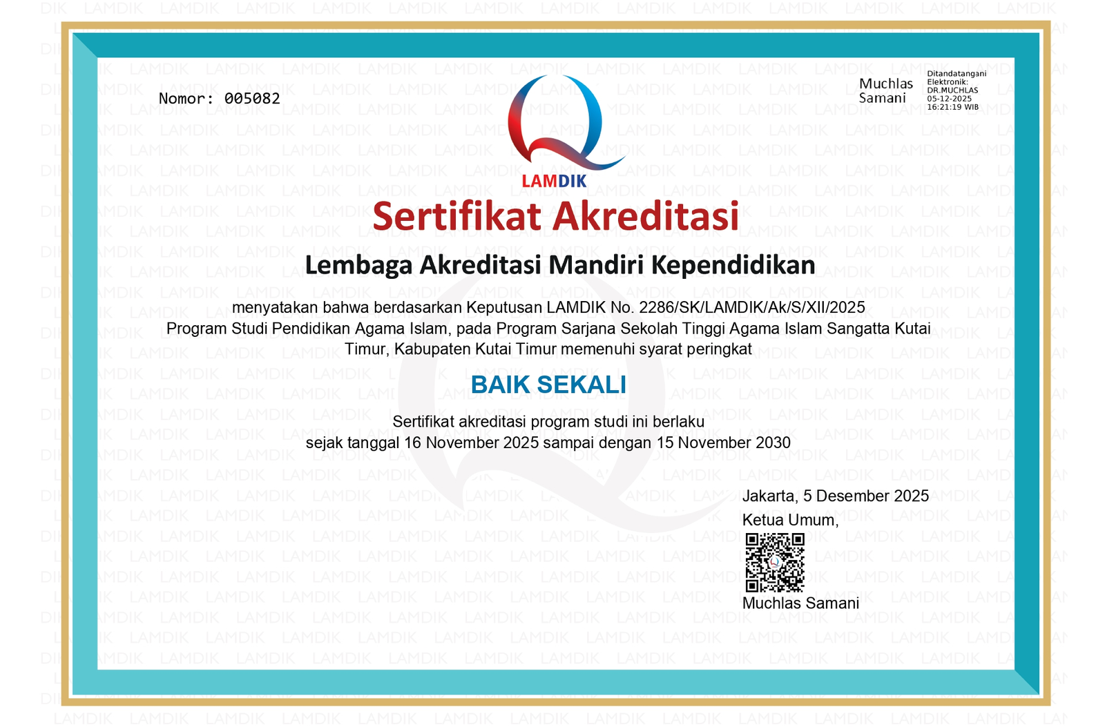 Capaian tersebut tertuang dalam Keputusan LAMDIK Nomor 2286/SK/LAMDIK/Ak/S/XII/2025, yang menyatakan bahwa Program Studi Pendidikan Agama Islam STAI Sangatta, Kabupaten Kutai Timur, telah memenuhi syarat akreditasi dengan peringkat Baik Sekali. Sertifikat akreditasi ini berlaku selama lima tahun, terhitung sejak 16 November 2025 hingga 15 November 2030, dan ditetapkan di Jakarta pada 5 Desember 2025 .