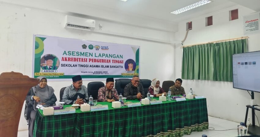 Sangatta – Sekolah Tinggi Agama Islam (STAI) Sangatta pada 21 November 2025 resmi menerima visitasi Asesmen Lapangan (AL) dari Badan Akreditasi Nasional Perguruan Tinggi (BAN-PT). Dua asesor hadir langsung, yakni Prof. Dr. Sugeng Listyo Prabowo, M.Ag. dan Prof. Dr. Sri Lumatussa’adah, S.Ag., M.H.I., untuk melakukan verifikasi data dan meninjau pelaksanaan Tridharma Perguruan Tinggi. Visitasi berlangsung di kampus STAI Sangatta dengan agenda verifikasi data, klarifikasi dokumen, serta peninjauan implementasi Tridharma Perguruan Tinggi.