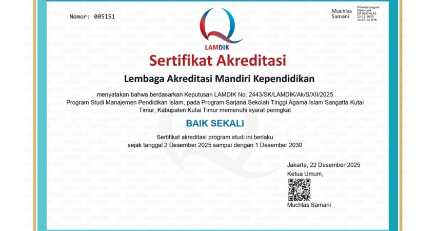 Sangatta – Program Studi Manajemen Pendidikan Islam (MPI) Program Sarjana Sekolah Tinggi Agama Islam (STAI) Sangatta, Kabupaten Kutai Timur, resmi meraih peringkat akreditasi “Baik Sekali” dari Lembaga Akreditasi Mandiri Kependidikan Selanjutnya